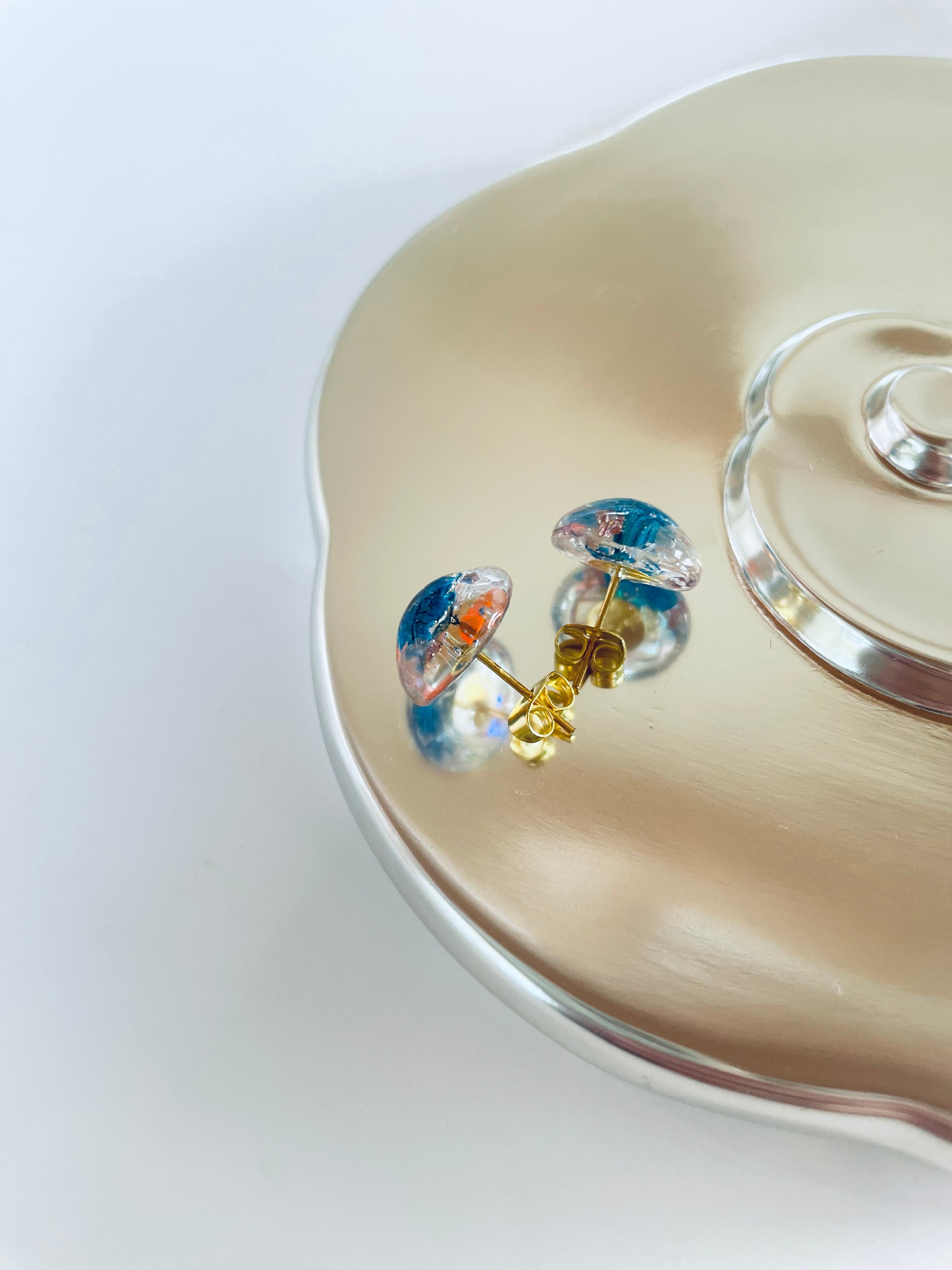 本物のかすみ草を閉じ込めた、まるでアクアリウムのような涼しげなピアスです。小さな青色のかすみ草が自然の美しさを引き立てます。落ち着いた色合いで、どんなコーディネートにも似合います。素朴なかすみ草とキラキラ反射する透明感は、身につけるたびに爽やかな気持ちにさせてくれます^ ^
