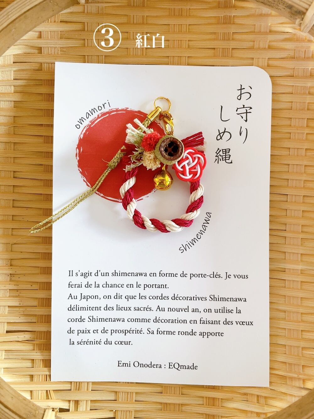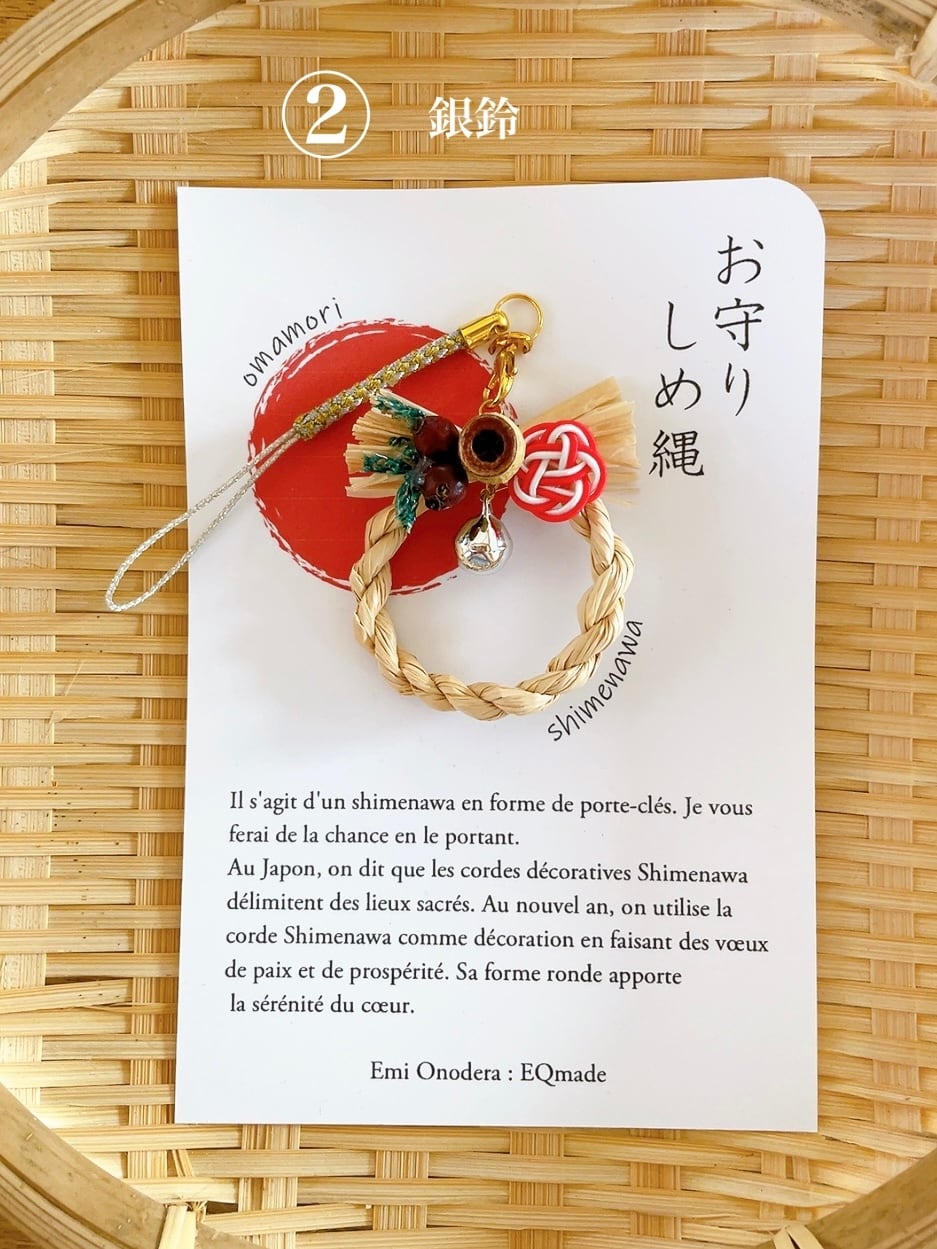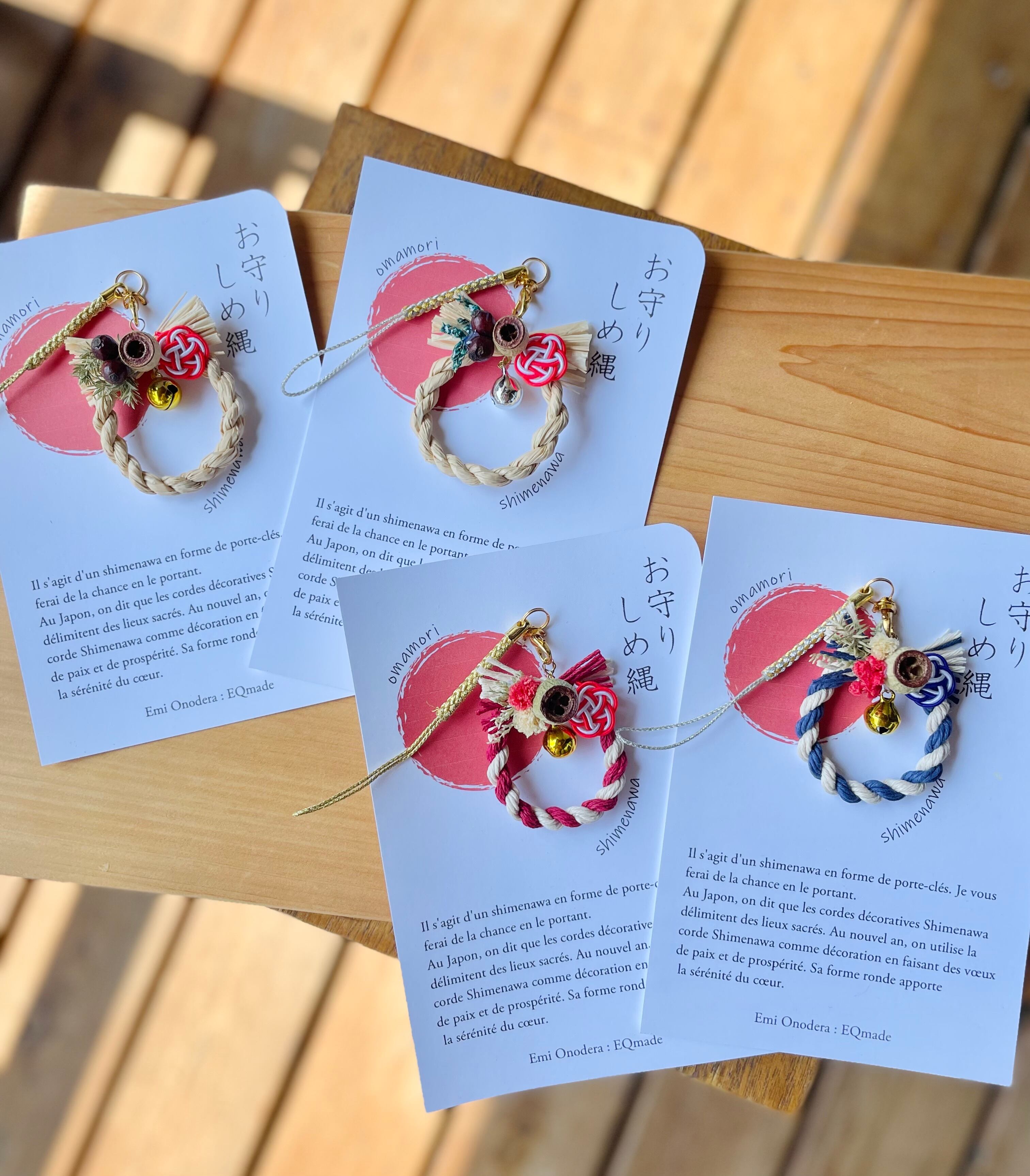 揺れる鈴が神社のような小さなしめ縄飾り型のお守りです。日本の伝統文化を感じさせるデザインが魅力で、心の平安と守りを届けてくれます。