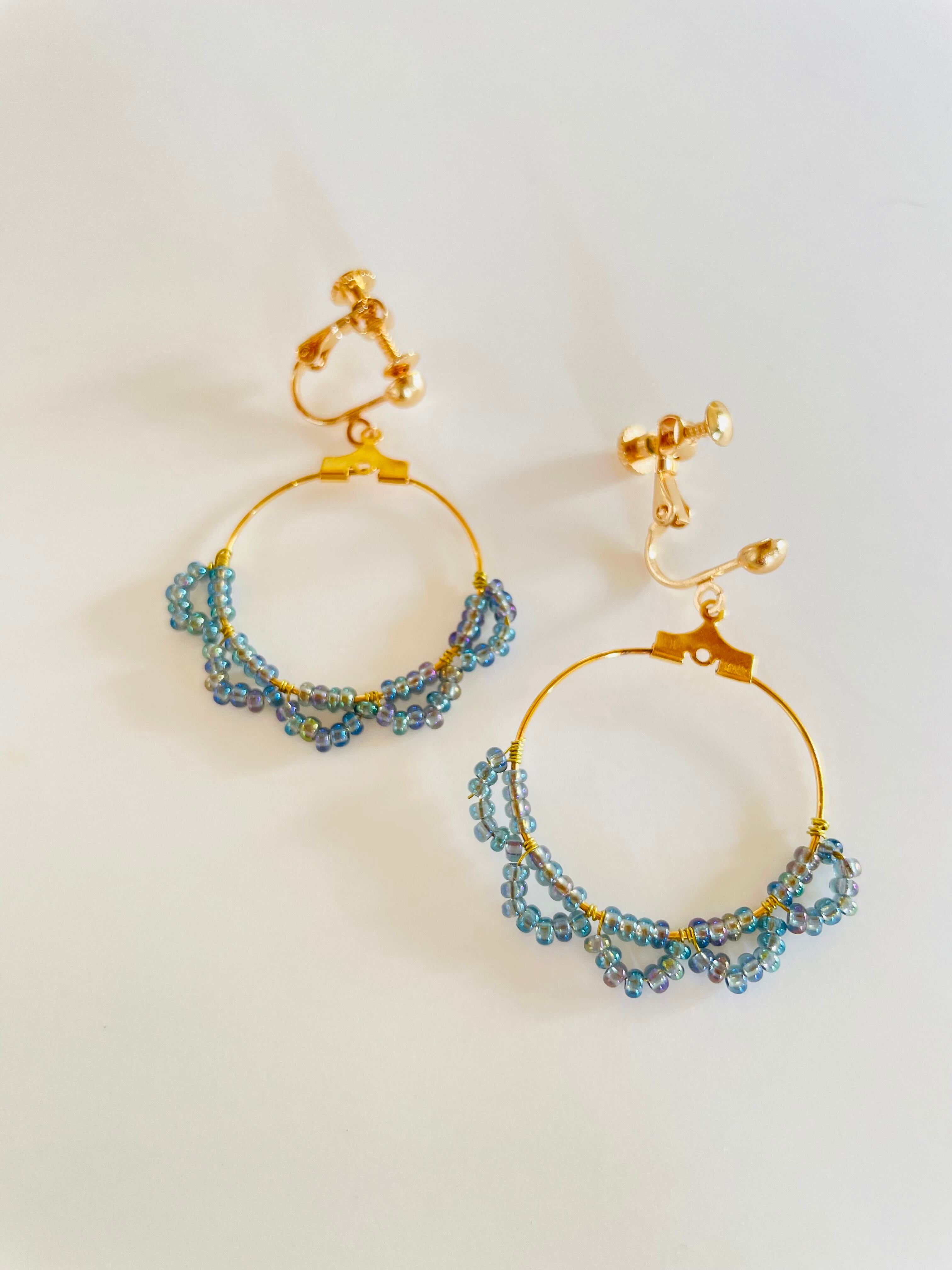 小さな青のビーズをレースのように繋げた、涼やかで優雅な印象のピアス/イヤリングです。青のビーズの繊細な色合いが、日常のコーディネートにさりげない華やかさをプラスし、存在感を放ちます。カジュアルなお出かけはもちろん、特別なシーンでもその魅力を発揮します。